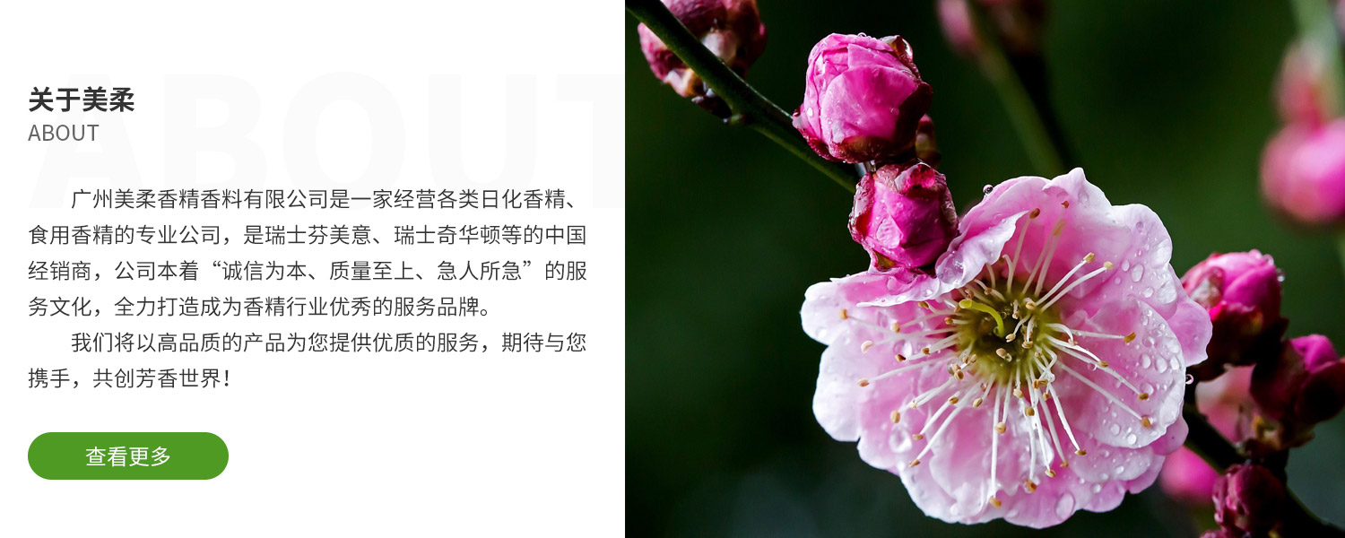 • 廣州美柔香精香料有限公司是一家經營各類日化香精、食用香精的專業公司,是瑞士芬美意、瑞士奇華頓等的中國經銷商,公司本著“誠信為本、質量第一、急人所急”的服務文化,全力打造成為香精行業第一服務品牌。